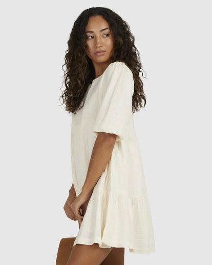 Made of cotton gauze fabric to give it a cloud-like lightness, this tiered mini dress has a floaty shape, puff sleeves, and a cute back tie.