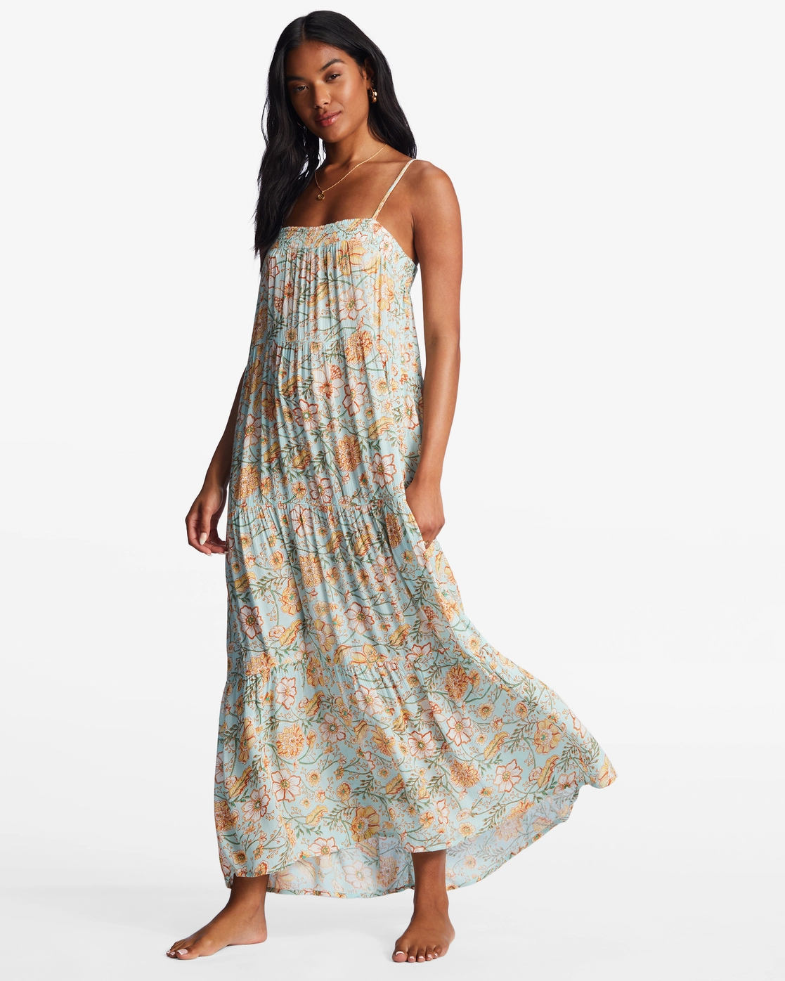 Made of airy crinkle fabric, this printed maxi dress has a floaty shape styled with a tiered ruffle skirt and thin straps. A perfect look for your next beach picnic.