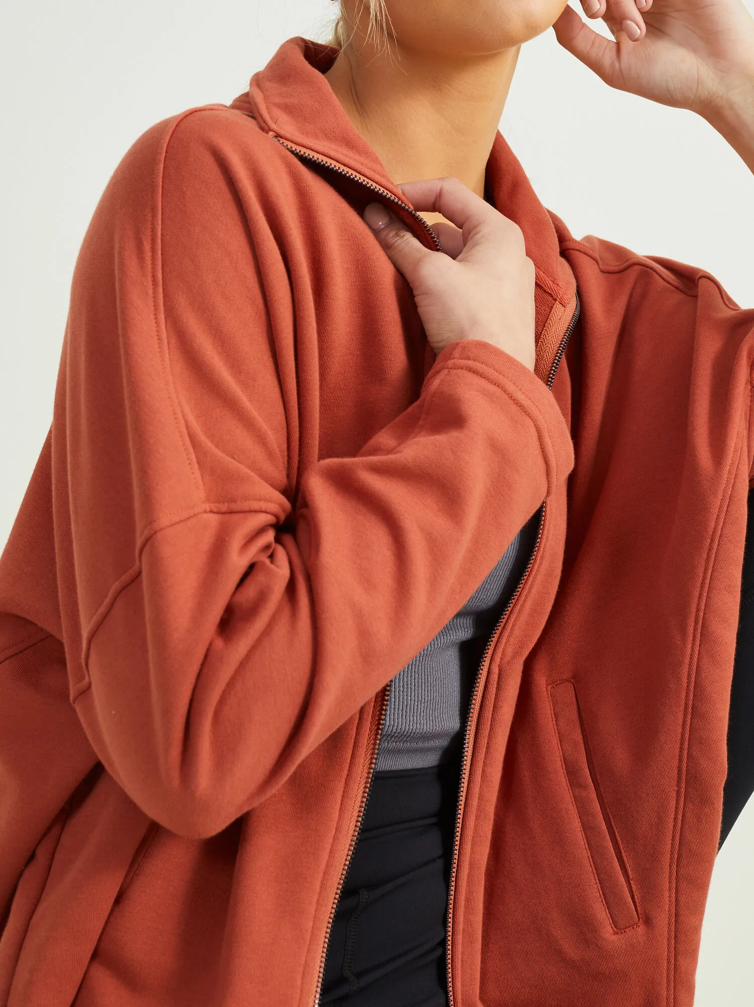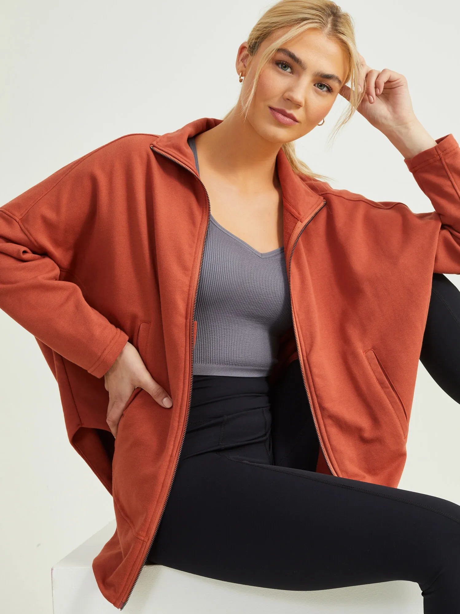 The hoodie of free flowing self-expression. You will feel confident to be yourself and give an extra flare of style to your daily athleisure look with this oversized hoodie! We love the curved hem, pockets, and unique two-way zipper.