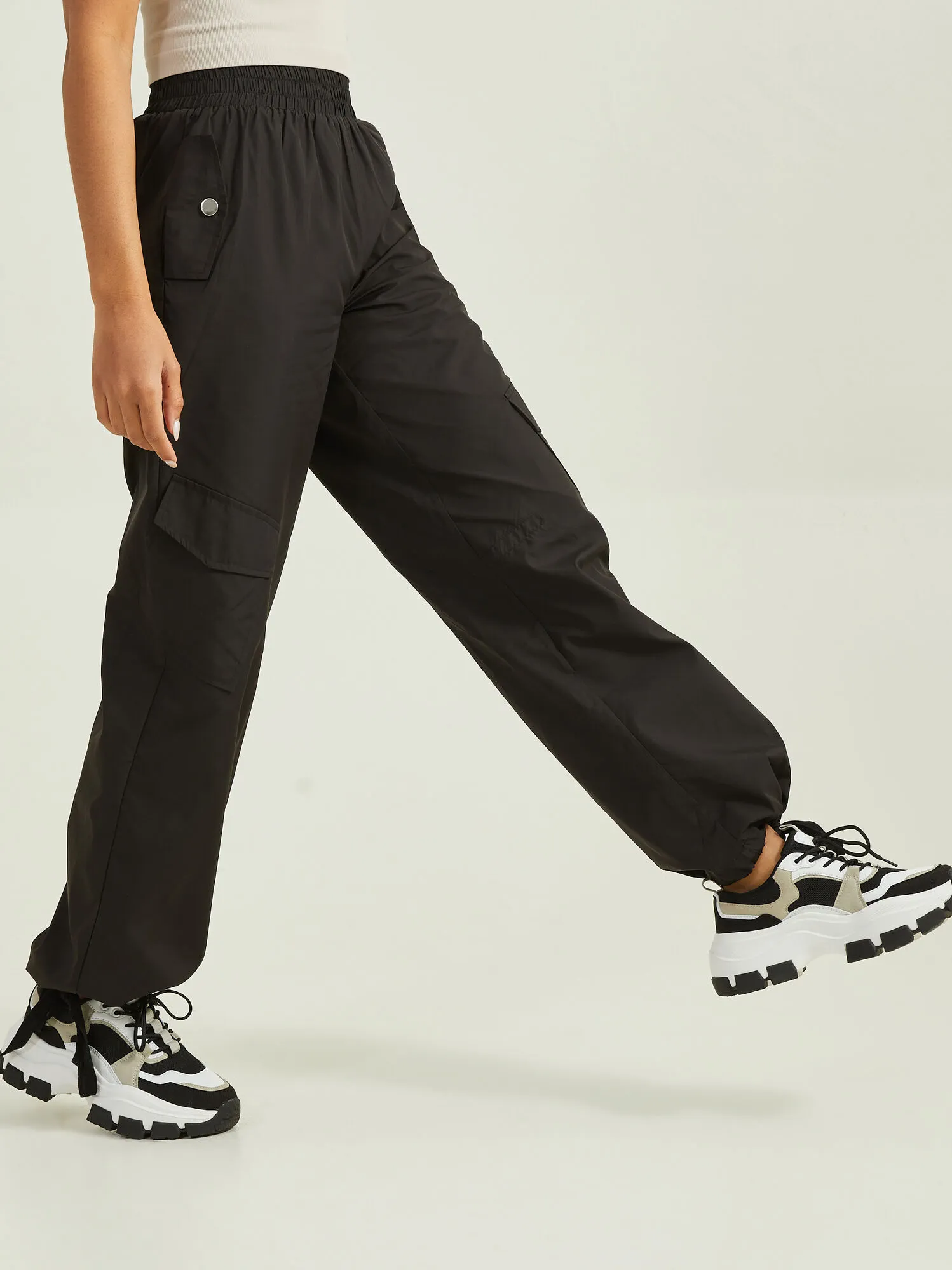 - Fit: Relaxed, gathered wide leg