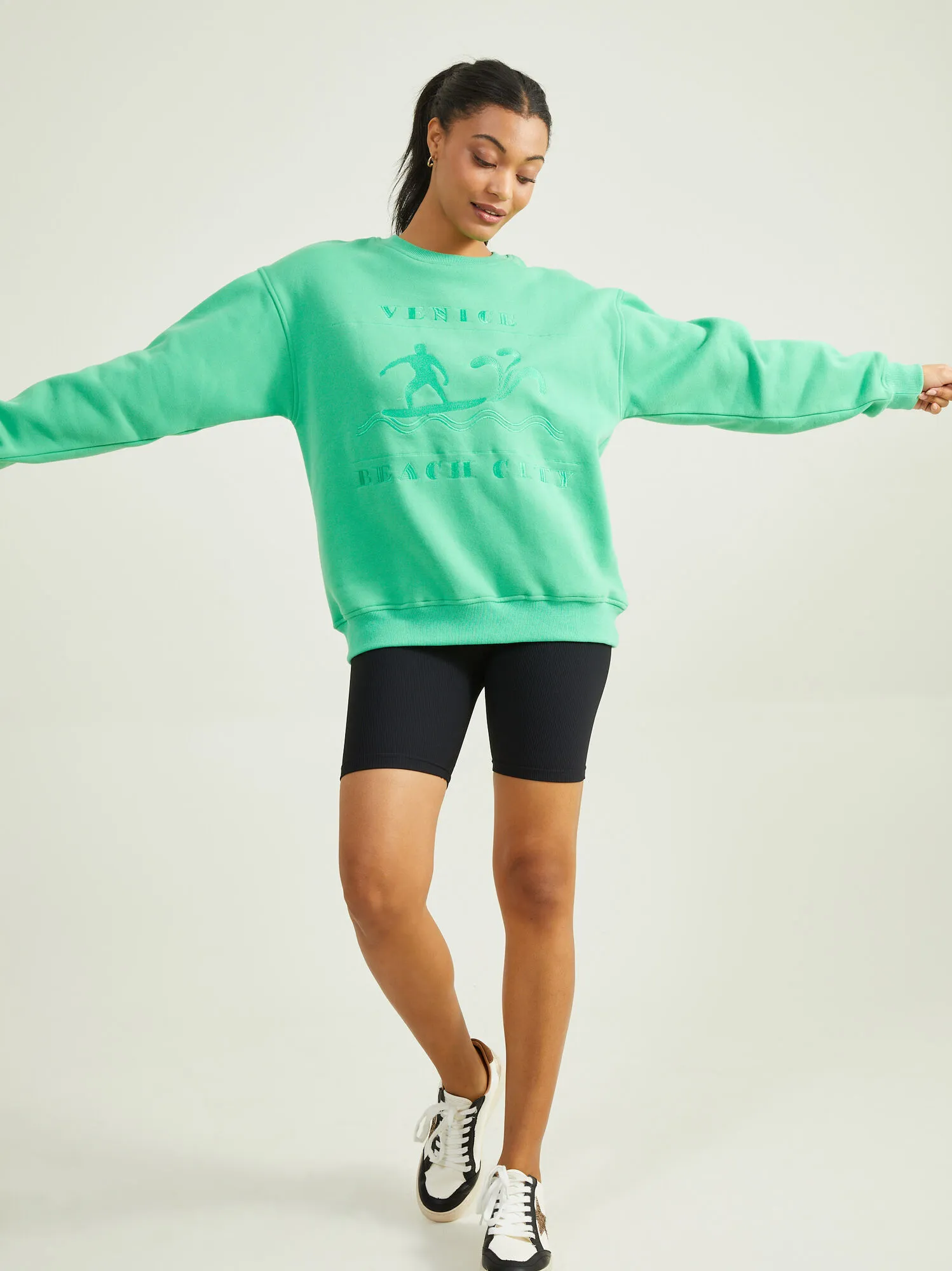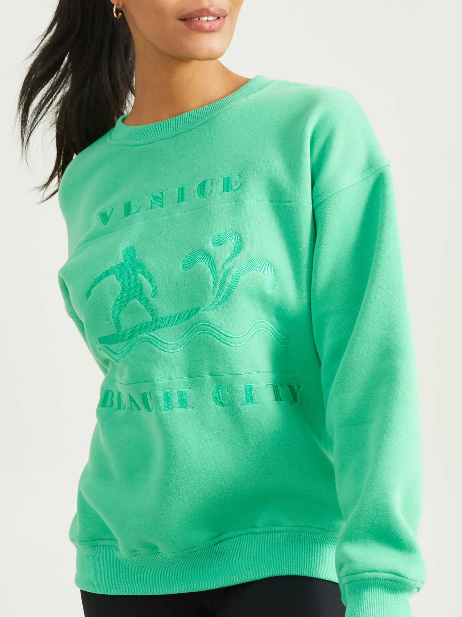 Keep the carefree beach vibes going through the winter with this cozy crew neck sweatshirt. The ribbed neckline and banded hem with the carefully embroidered stitched graphic lettering give this a classy look that will pair flawlessly with all of your beanies and joggers for the perfect athleisure look.