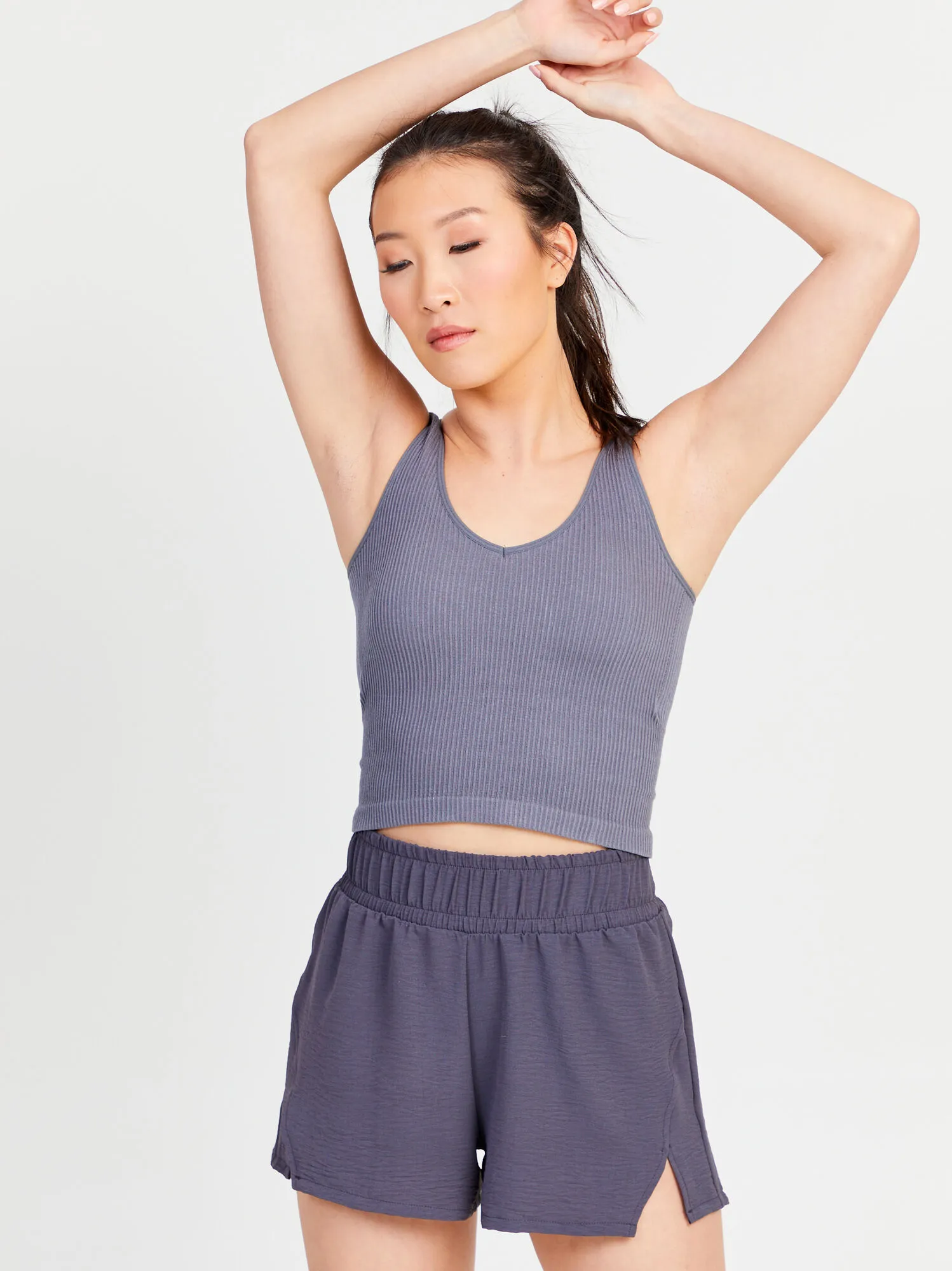 This compression tank is a workout wear essential! This tank features an ultra soft ribbed material and cropped style that is perfect to pair with any of your favorite shorts or high waisted bottoms. This tank also features added support with a built in shelf bra. One size fits most.Â